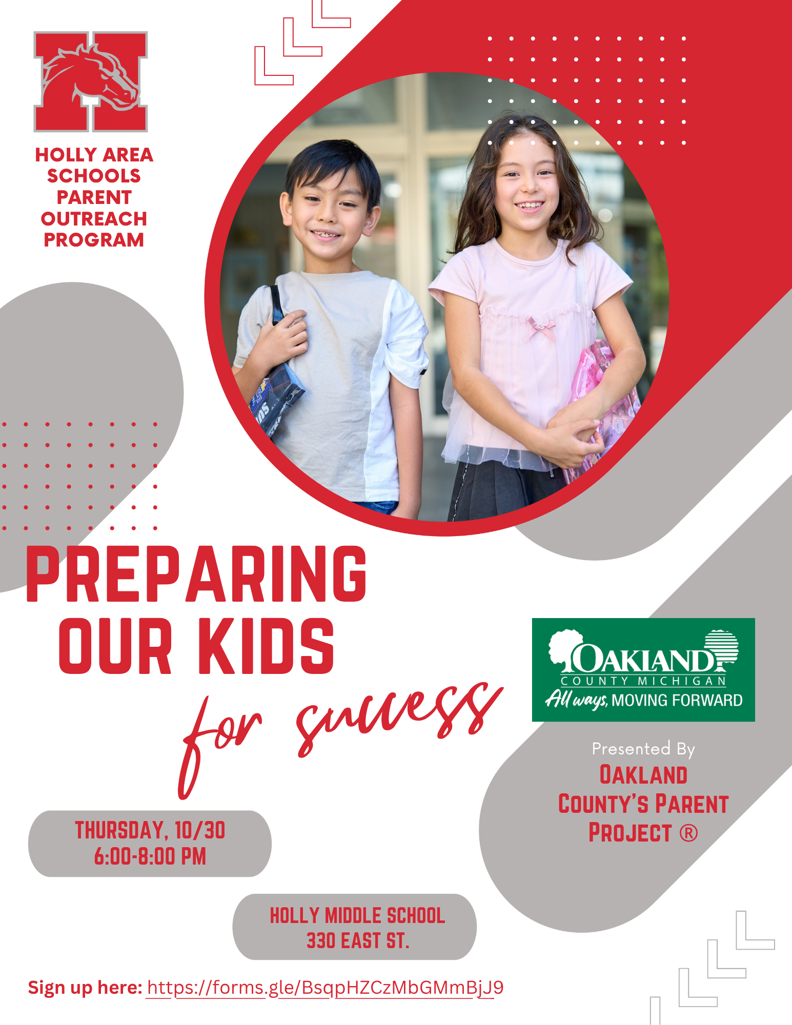 On Thursday, October 30, 6:00 - 8:00 PM at Holly Middle School, join Oakland County’s Parent Project® and the Holly Area Schools Parent Outreach Program for an evening focused on helping children thrive in school and beyond!